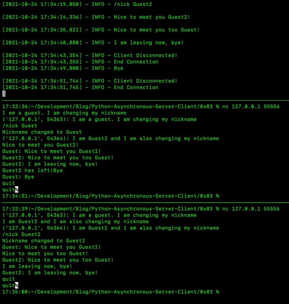 shutdown_server()will send out quit messages to our clients. As of right now, this doesn’t actually do anything but we may use this later in the future if we decide to create our own python clients instead of using netcat. At the end of this function, we will then finally shutdown our asyncio loop.